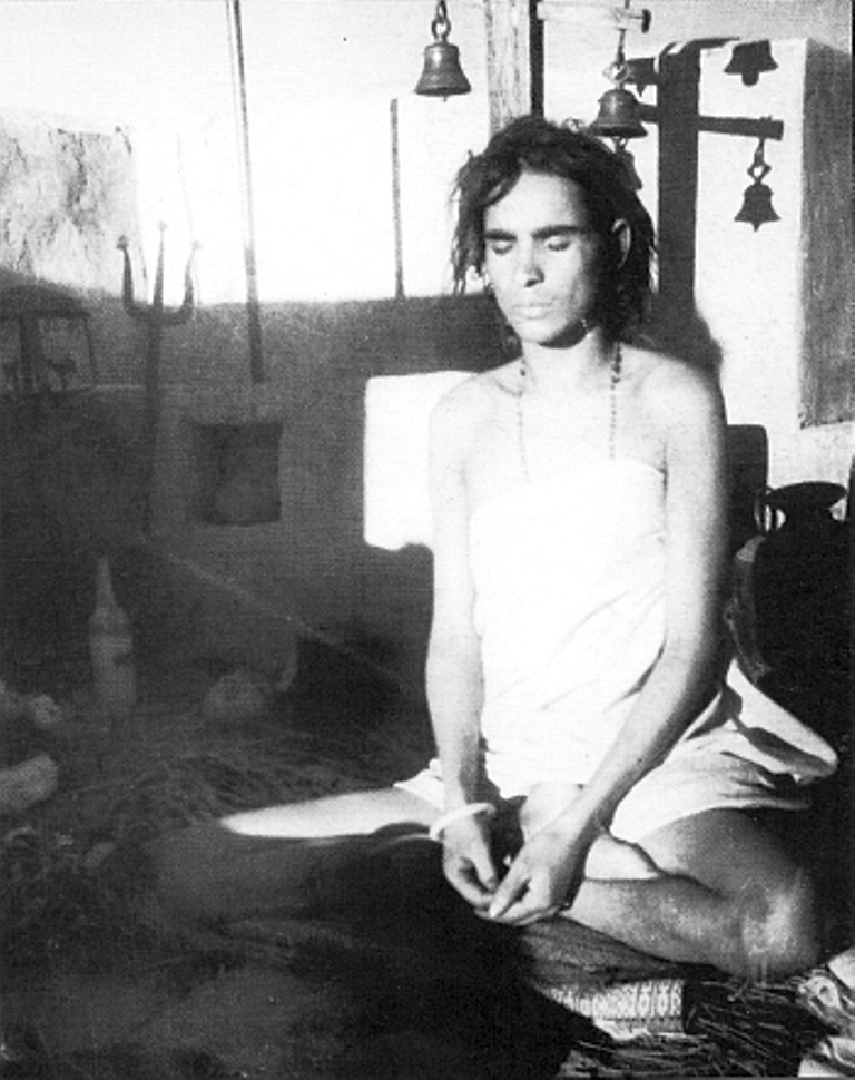 Baba ji had golden hair and the Dhuni burned in front of the cave while the devotees sang kirtan.